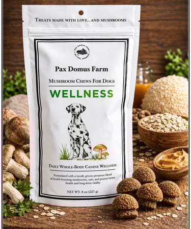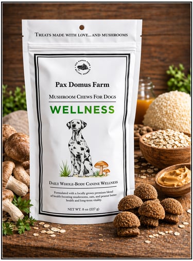 PAX WELLNESS CHEWS are a premium blend of healthy mushrooms treats baked in small batches for our canine friends. Each chew contains Shiitake, Lion’s Mane, Maitake, Reishi and Turkey Tail mushrooms harvested with care, intention, and research-backed purpose to promote the wellness of our pets.