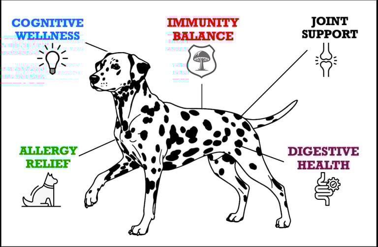 COGNITIVE WELLNESS. Lion’s Mane and Reishi mushrooms naturally support cognitive wellness and stress relief. Lion’s Mane promotes nerve growth, memory, and mental clarity, while Reishi calms the nervous system, eases stress, and encourages restful sleep. Together, they enhance focus, protect brain health, and foster emotional balance. This powerful duo helps your dog stay sharp, centered, and resilient—providing a natural way to support mental clarity for overall cognitive and emotional well-being.